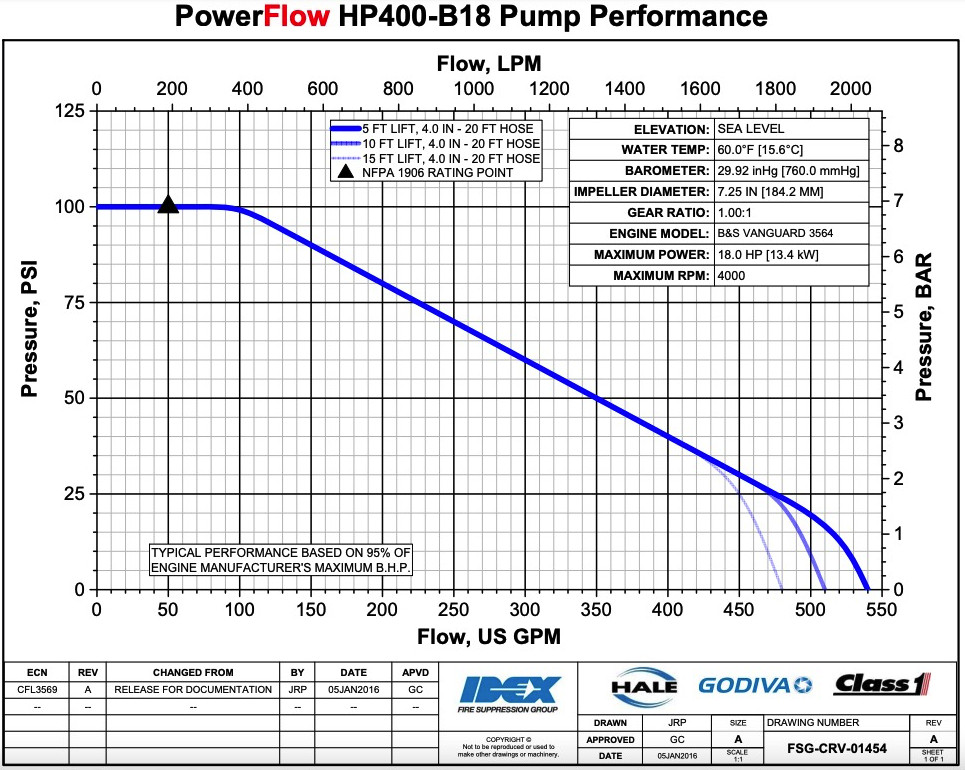 The pump/engine shall be capable of meeting the NFPA 1906 performance rating of 50 GPM @ 100 PSI. Typical pump performance from 5 foot draft at sea level shall be: